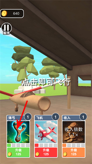 2、在界面中升级弹弓道具,道具升级是增强动力的核心步骤,升级后可提升飞机的初始飞行动力,助力飞行距离的提升。