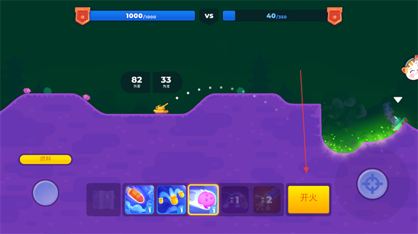 2、瞄准敌方目标后,点击下方开火按钮,发射炮弹攻击敌方坦克。