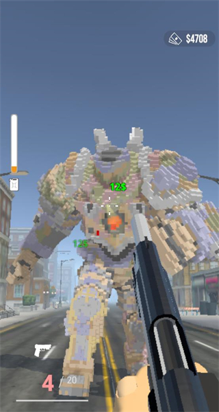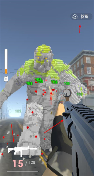 3、挑战过程中,使用武器射击方块怪兽,命中后造成伤害,同时积累金币奖励。