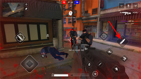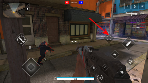 1、瞄准红色箭头指向的敌方目标射击,这是击败敌人、积累击杀数的核心操作,需精准瞄准敌方位置。