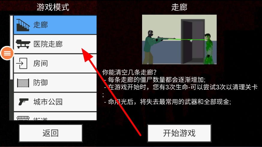 1、进入游戏时,先选择游戏模式,像走廊、医院走廊等不同场景模式,选定后点击开始游戏,进入对应场景开启僵尸对抗。