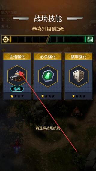3、战机升级后出现战场技能选择界面可在主炮强化、必杀强化、装甲强化中挑选技能增强战力。