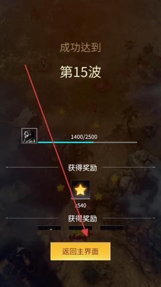 4、成功达到一定波次如第15波后查看获得的奖励点击返回主界面按钮结束当前战斗回合。