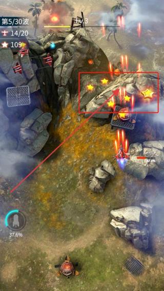 1、进入主界面查看屏幕上方显示的波次与等级等信息操控战机移动射击消灭敌方飞机。