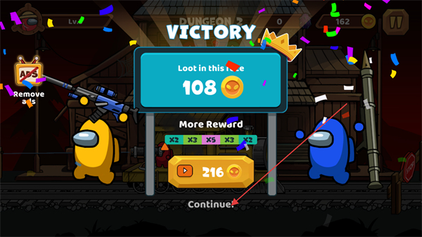 4、完成关卡获得金币奖励,点击Continue!继续挑战下一关。