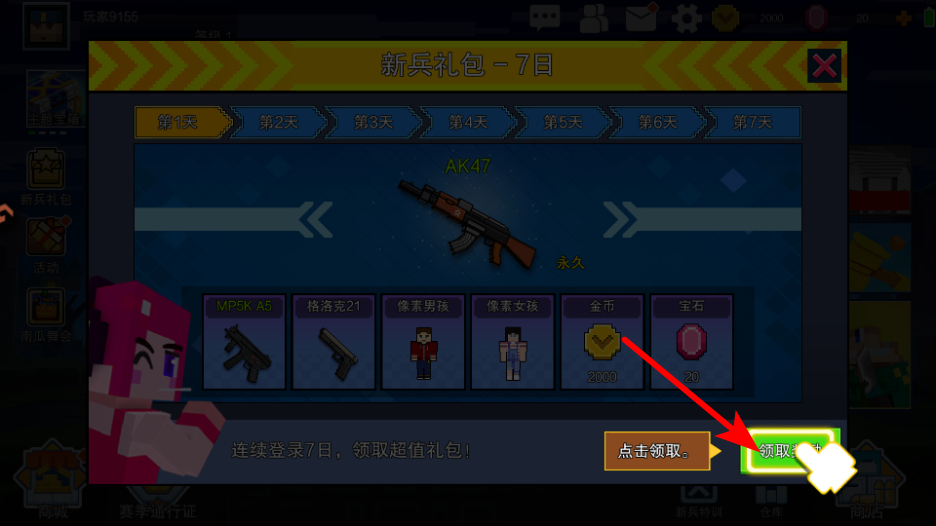 2、点击领取奖励按钮,可获取新兵礼包的丰厚资源,这是积累战力的关键步骤,领取时需及时操作以获取武器和道具。