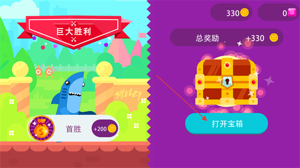 4、战斗获胜后会出胜利的标识,若为首次获胜还会有首胜对应的额外奖励,同时可点击打开宝箱来领取此次战斗对应的总奖励。
