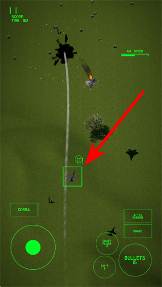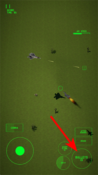 3、发现敌方战机时,点击BULLETS按钮发射子弹进行攻击,需留意子弹剩余数量,合理把握射击时机以有效打击敌人。