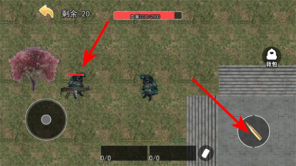 3、遇到敌人后,先点击红色箭头指向的敌人目标锁定攻击对象,再点击右侧子弹按钮切换武器弹药,准备发起攻击推进战斗进度。
