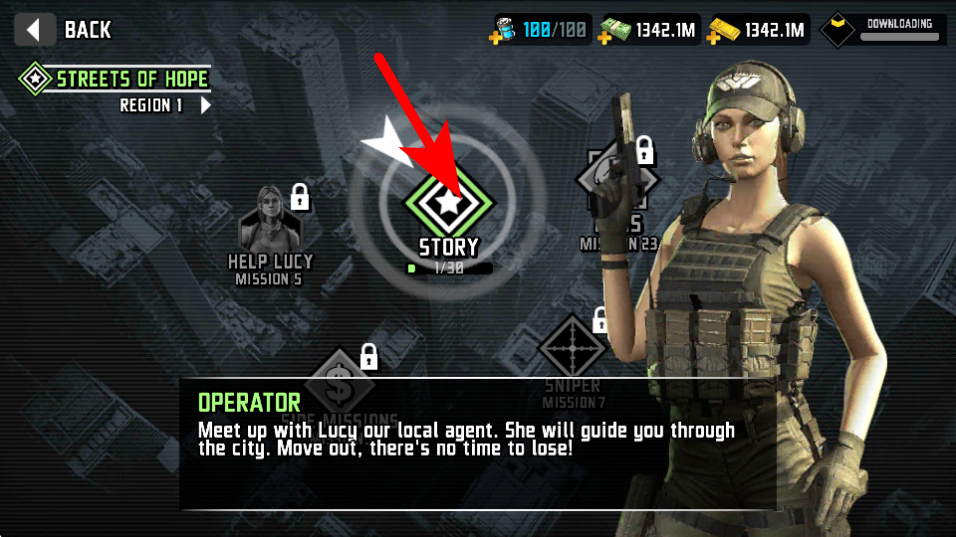 1、进入游戏后,点击箭头指引的选项,这是开启剧情任务的关键操作,点击后即可进入对应任务的战斗场景。