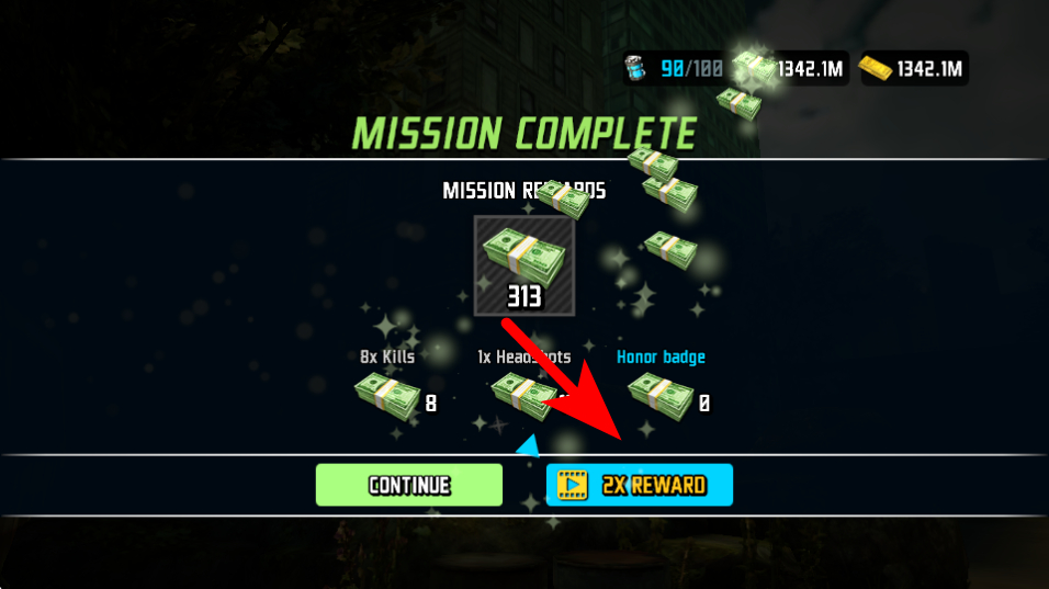 右侧红色按钮提供明确任务提示,完成关卡挑战可获得丰厚奖励,奖励模式更能带来额外回报,积累的金币和钞票可用于解锁武器与装扮,激励持续游玩。