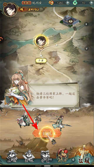 1、进入游戏后,点击开始征战按钮,派遣三位将军上阵追击黄巾军,这是开启战斗的关键操作。