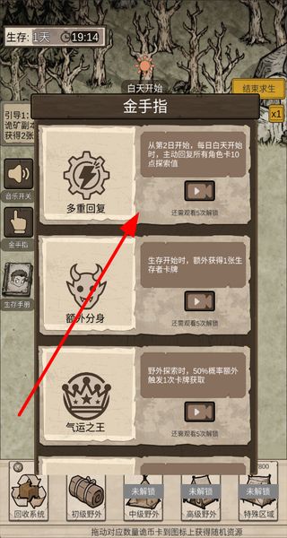 3、打开金手指界面,解锁对应的功能,这些功能能提供探索值回复额外卡牌等助力,提升生存效率。