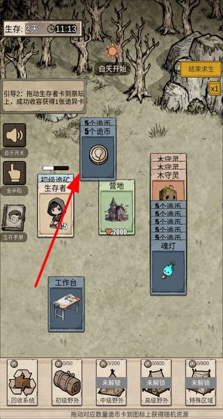1、拖动生存者卡到对应建筑图标上,完成采集类操作,可获得诡币卡等资源,积累资源推进生存冒险。