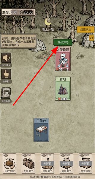 4、在晚上开启后,点击挑战按钮应对入侵的诡异,完成挑战可推进游戏进度,提升生存的天数。