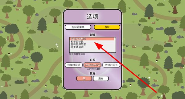 1、在选项界面,可挑选不同剧情,像独自在树林中等,还能设置日长持续时间,选择是否开启教程。