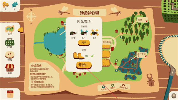 1、在独角仙公园界面选阳光农场关卡,点击开始!进入捕捉场景。