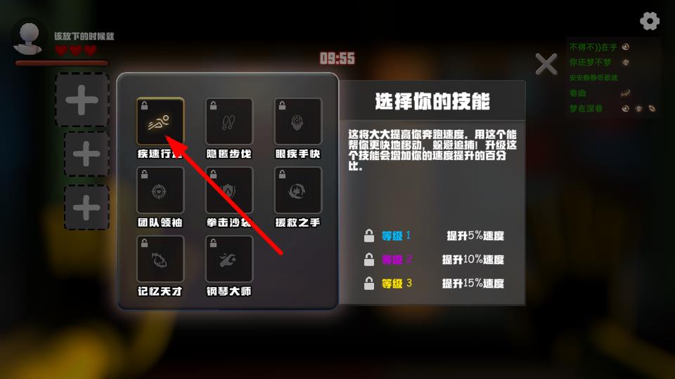 1、在技能选择界面,优先选择疾速行技能,该技能可提升奔跑速度,助力更快移动躲避追捕,升级后速度提升。