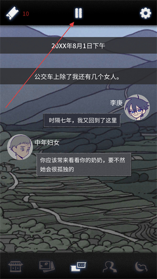 2、进入先祖遗愿剧情环节,查看李庚与中年妇女的对话,可点击顶部按键暂停剧情。