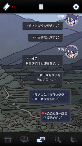 3、在先祖遗愿剧情中,阅读李庚的内心独白,选择下方的选项比如奶奶的身体应该还很硬朗吧等,推进剧情。