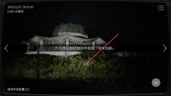 2. 进入监测场景后会显示剧情提示,您负责监测的物业中发现异常现象。若想快速推进,可点击界面中的SKIP按钮跳过剧情。