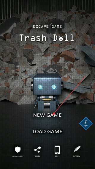 1、打开垃圾玩偶的启动界面,点击NEWGAME可开启新的逃脱解谜游戏,选择LOADGAME可加载已有存档。