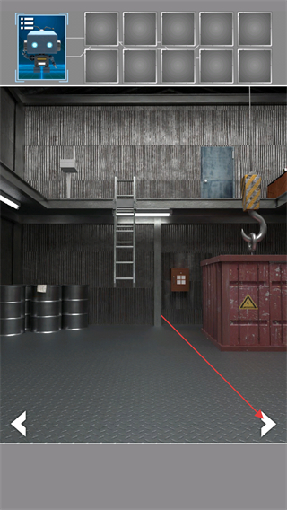 3、这是逃脱类游戏的仓库场景,点击界面的左右箭头按钮,可切换视角探索梯子箱子等物品,这些操作将助力推进解谜进程。