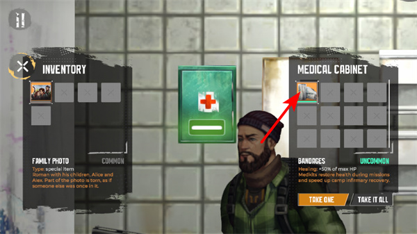 4、进入医疗柜界面后,可选择获取医疗物品,如绷带,恢复生命值并加快营地医疗恢复速度,利用医疗物品保障角色生存。