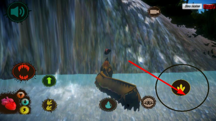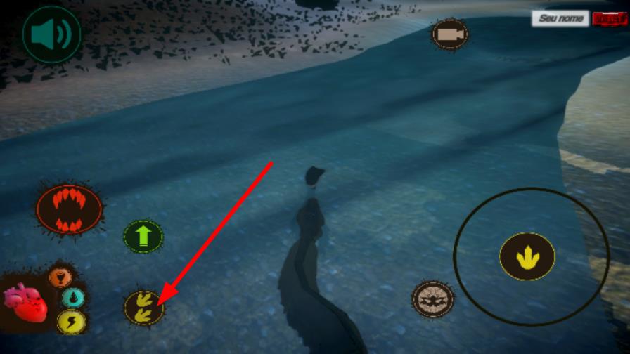 1、在水域场景中,点击右侧黄色脚印按键,操控角色在水中移动,以此探索水域区域,寻找资源推进游戏进程。