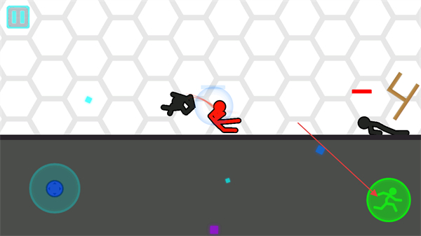 4、关卡中遇到敌方角色时,点击右侧绿色按钮可让火柴人发动攻击,击败敌人后即可继续推进游戏进程。