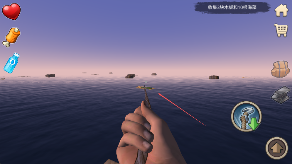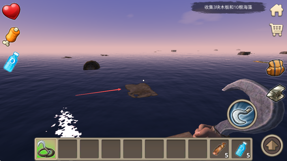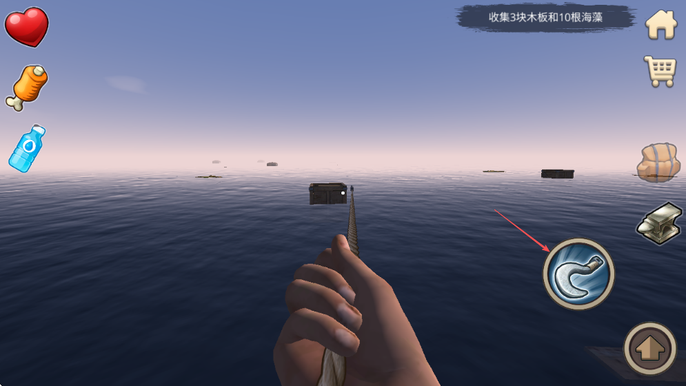 4、持续观察海面资源分布,利用钩子收集更多资源保障木筏生存建设。