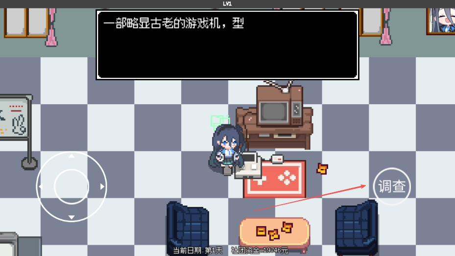 1、进入游戏画面看到古老游戏机,点击调查按钮,查看游戏机相关信息。
