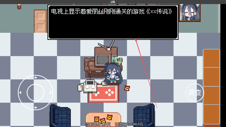 3、让爱丽丝靠近电视机,点击调查了解电视上显示的xxx传说通关信息。