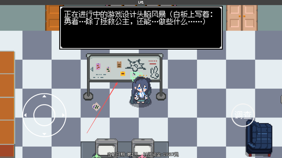 4、操控爱丽丝来到白板处,点击调查,查看正在进行的游戏设计头脑风暴内容。