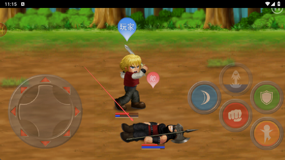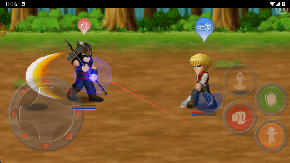 1、通过左侧虚拟摇杆控制角色移动靠近敌人,准备展开攻击。
