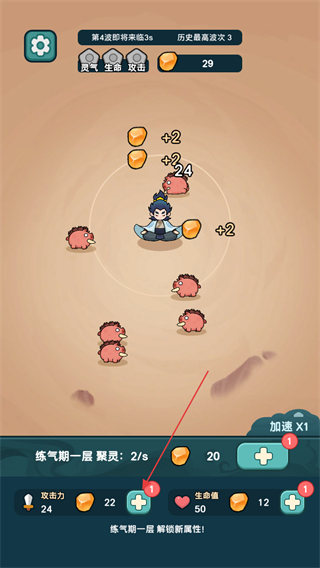 3、波次推进后击杀怪物获得的资源会增加,第4波来临前及时升级攻击、生命提升战力应对更强波次。