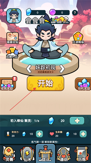 1、进入战斗界面后,点击妖踪初现下方的开始按钮开启挑战,可通过界面按钮提升初始的攻击、生命属性助力应对后续波次。