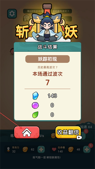 4、挑战结束后弹出战斗结算界面,查看通过波次与获得的奖励资源,可选择返回或点击收益翻倍获取更多奖励。