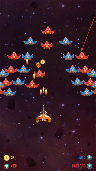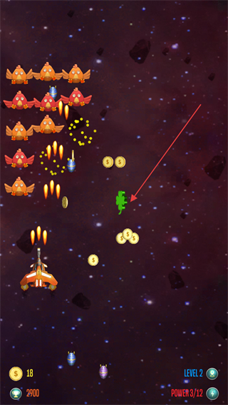 3、击杀小鸡会随机掉落金币或四叶草等升级道具,移动飞机去获取道具可以提升飞机能力。