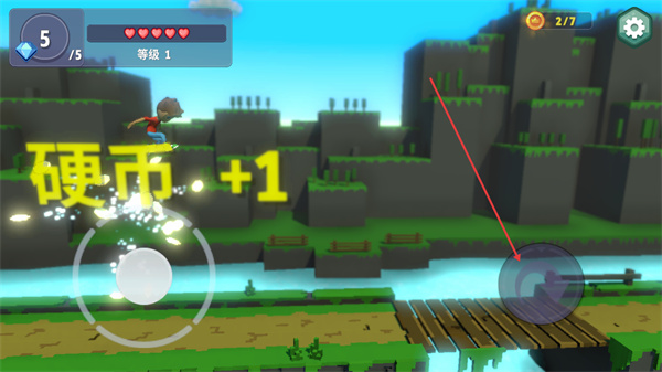 4、可利用右侧的跳跃按钮辅助操作,收集金币后界面会显示硬币+1的提示,继续收集剩余金币以推进关卡。