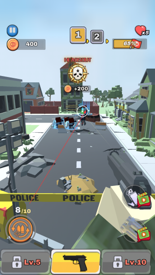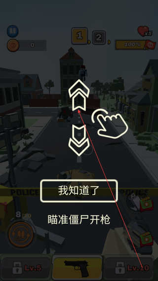 2、游戏开始后,按照提示滑动屏幕控制瞄准方向,当僵尸出现时,点击开枪按钮,瞄准僵尸开枪射击。