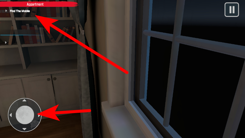 2、在关卡房间内,观察任务点击左下角移动按钮,调整视角切换场景。