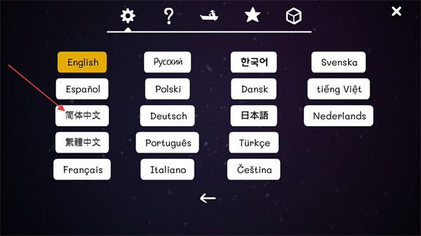 3、在展开的语言选择列表里,找到并点击简体中文选项,即可将游戏的显示语言切换为简体中文,便于后续操作。