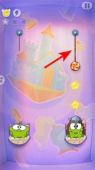 3、继续在屏幕上滑动手指,切断红色箭头指向的右侧绳子,让糖果掉落至对应的奥姆处,同时留意糖果的掉落路径,确保两个奥姆都能获取糖果。