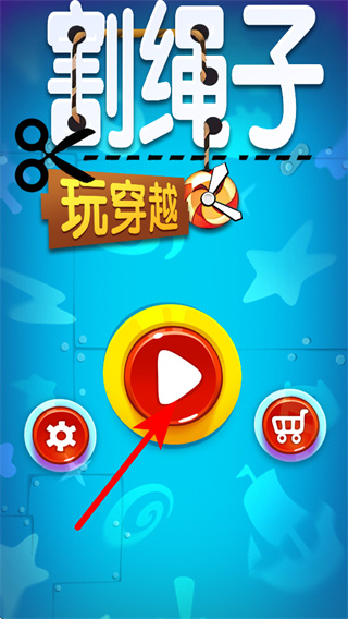 1、进入割绳子玩穿越的启动界面后,点击红色箭头指向的红色播放按钮,开启游戏关卡,这是进入游戏的关键操作,准确点击才能加载关卡内容。