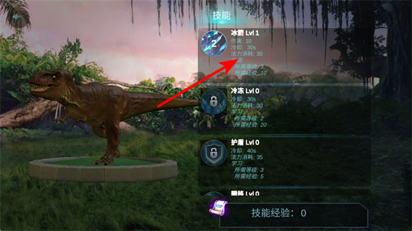 4、进入技能界面,解锁并升级冰精等技能,技能可增强霸王龙的战斗能力,如冰精能对敌人造成冰冻伤害。