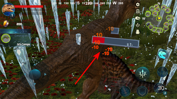 2、操控霸王龙靠近美颌龙等猎物,利用地图和虚拟摇杆精准定位目标,接近猎物是发起有效攻击的前提。