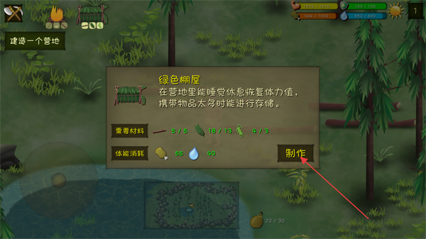 4、点击左上角的工具按钮,选择建筑庇护所,点击绿色棚屋的制作按钮消耗体能属性进行搭建。
