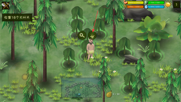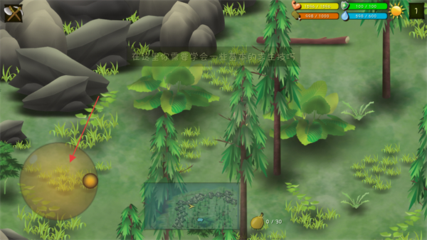 2、通过左下角的方向键控制角色移动,在森林中收集生存资源。