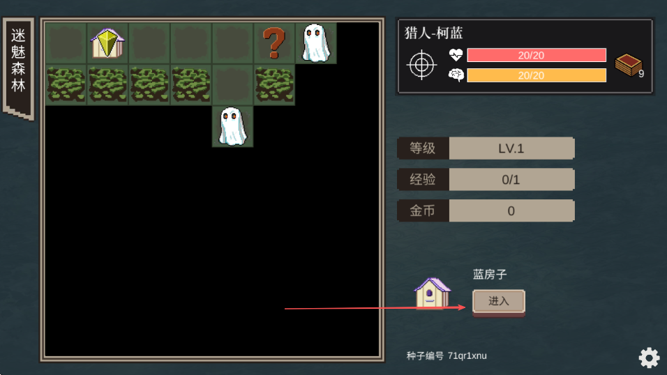 4、遇到红房子、蓝房子等建筑,点击进入按钮,探索建筑内部,获取道具等资源,推进游戏进程。